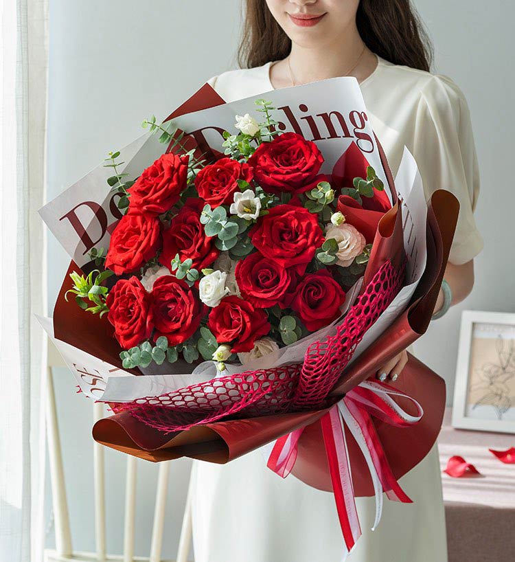 红玫瑰纯束红色包装纸正面平视纯白背景
